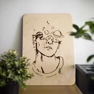 „Otwarty umysł” to dekoracja ścienna, która mówi o odwadze myślenia inaczej, sięgania dalej i przekraczania schematów. Wykonany na sklejce brzozowej o grubości 6 mm z precyzyjnym grawerem laserowym, obraz przedstawia twarz z unoszącymi się wokół planetami – symbolizującymi myśli, wyobraźnię i nieskończone możliwości.
