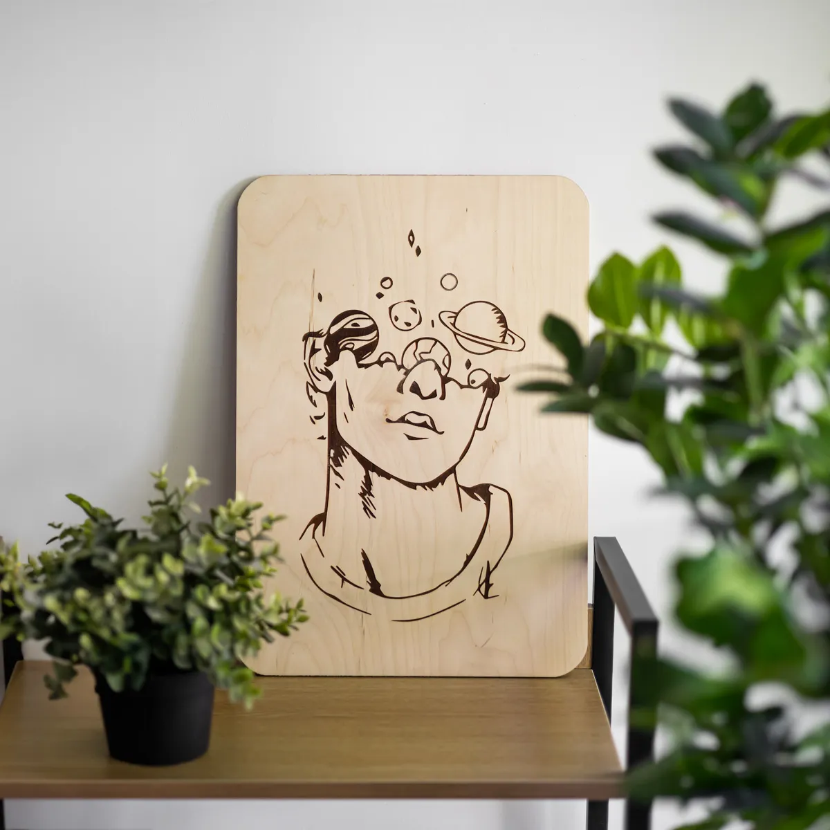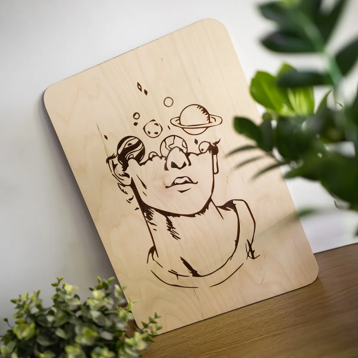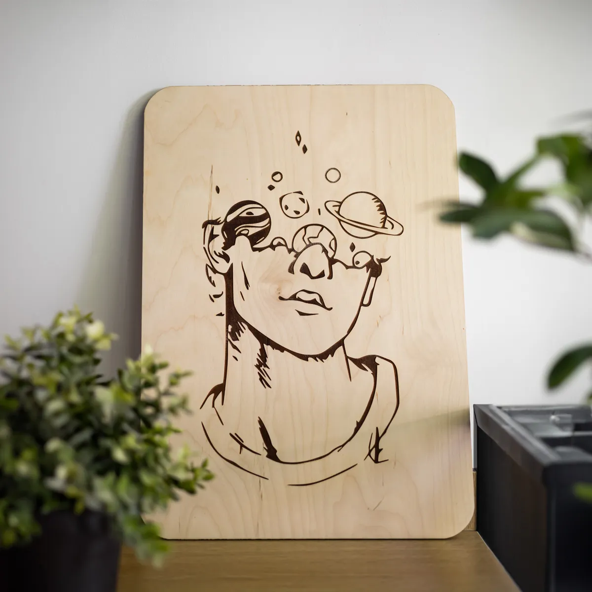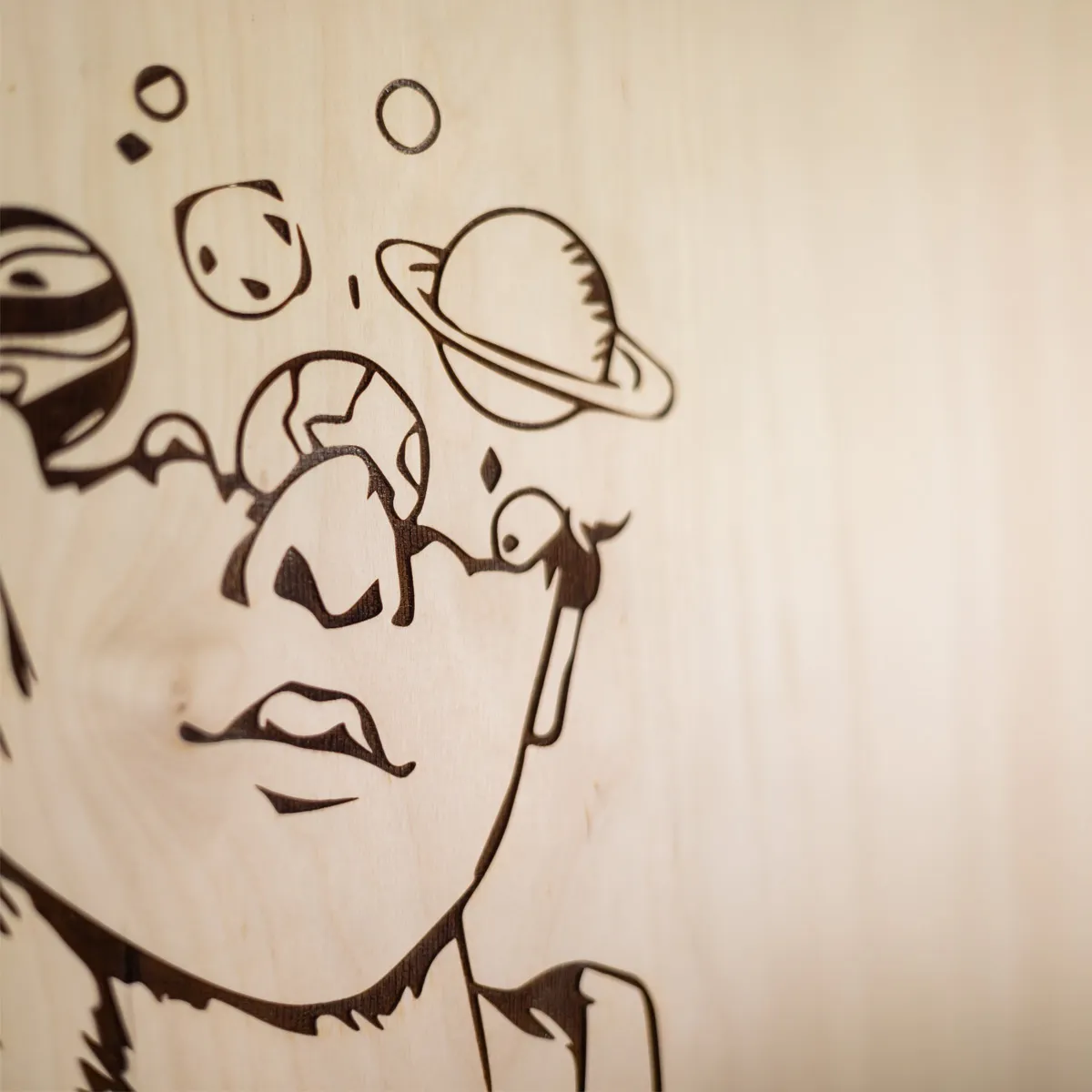 Obraz „Otwarty umysł” – grawerowana dekoracja ze sklejki brzozowej 6 mm | Kosmiczna inspiracja do nowoczesnego wnętrza