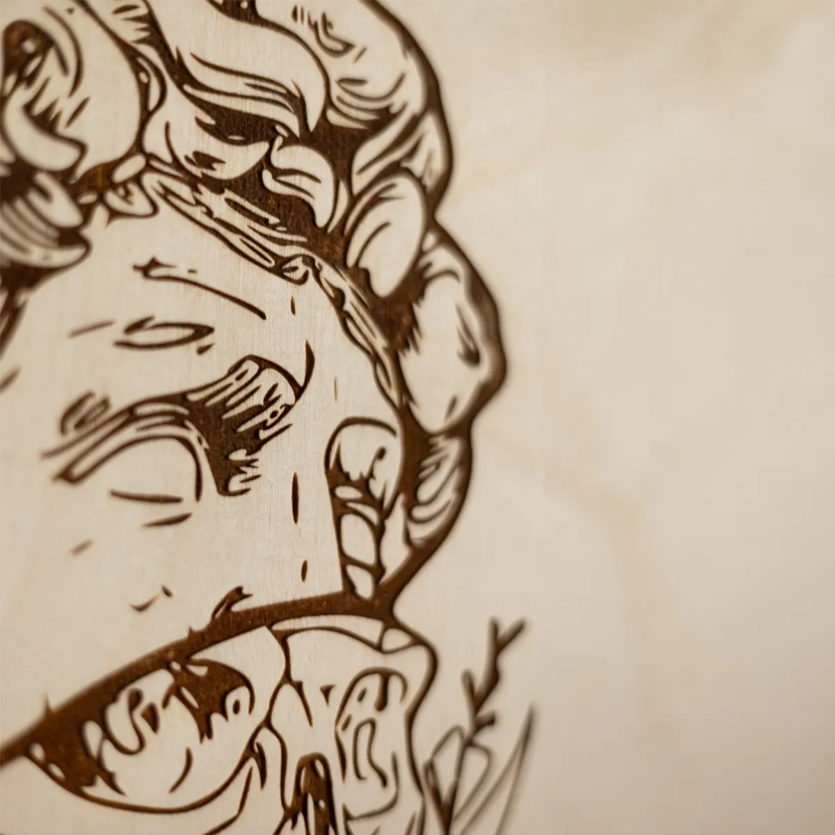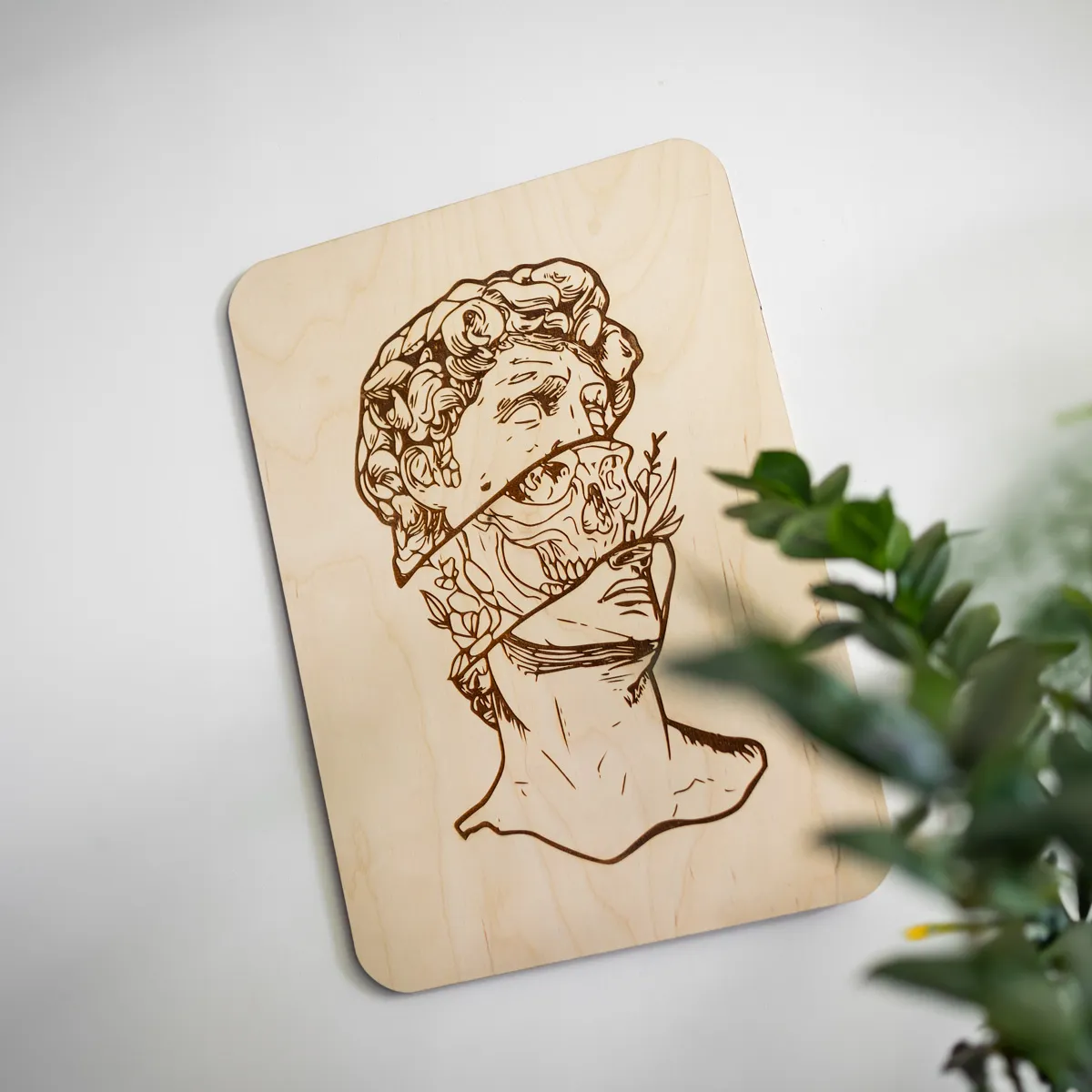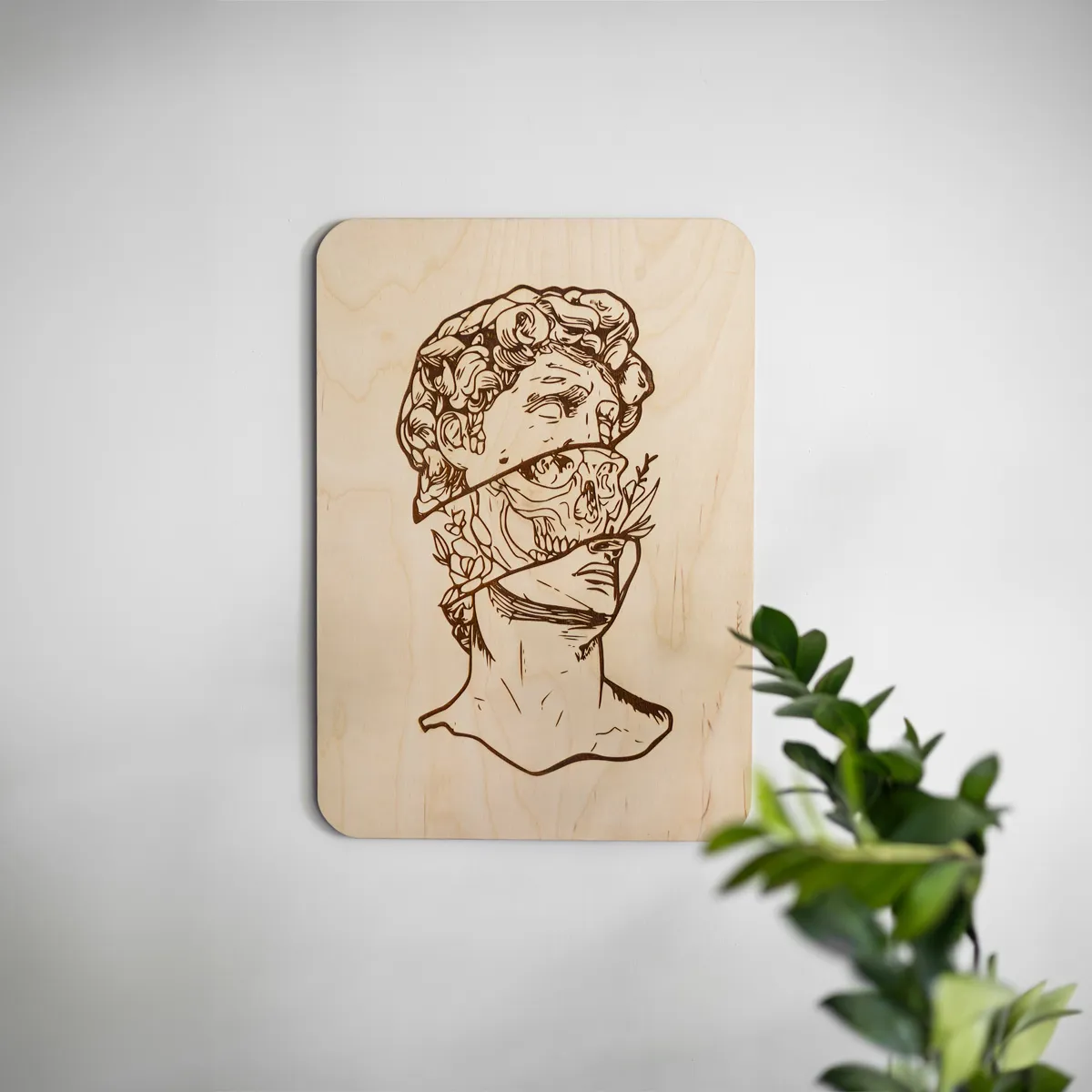 „Przemiana” to wyjątkowa dekoracja ścienna, która przyciąga spojrzenia i prowokuje do refleksji. Laserowo grawerowana grafika inspirowana klasyczną rzeźbą ukazuje symboliczny motyw rozłamania – kontrast między życiem, śmiercią i naturą, a jednocześnie ideę duchowego odrodzenia. Całość została wykonana na naturalnej sklejce brzozowej o grubości 6 mm, co podkreśla organiczny, surowy charakter tej artystycznej formy.
