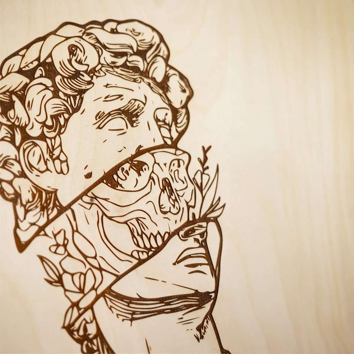 Obraz „Przemiana” – artystyczny grawer na sklejce brzozowej 6 mm | Kontrast życia, śmierci i odrodzenia