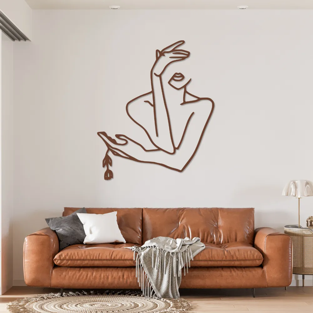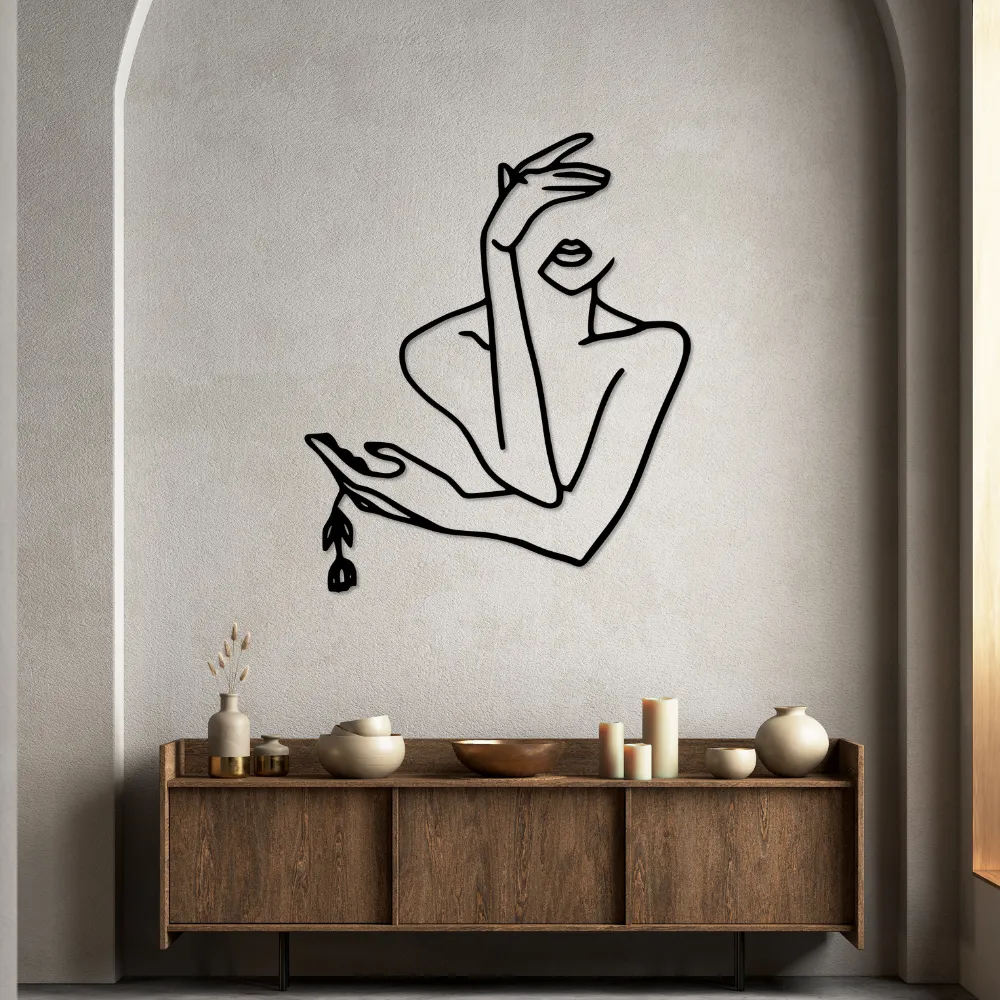 Obraz przedstawia stylizowaną sylwetkę kobiety z zakrytą twarzą i delikatnie opuszczoną dłonią, trzymającą kwiat. Kompozycja emanuje spokojem, subtelnością i artystyczną elegancją – idealna do wnętrz, które mają wyrażać równowagę i kobiecą siłę.