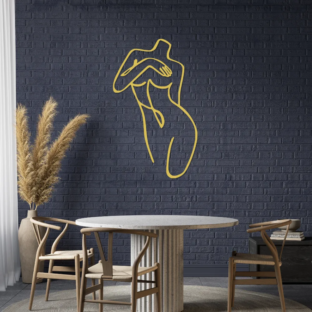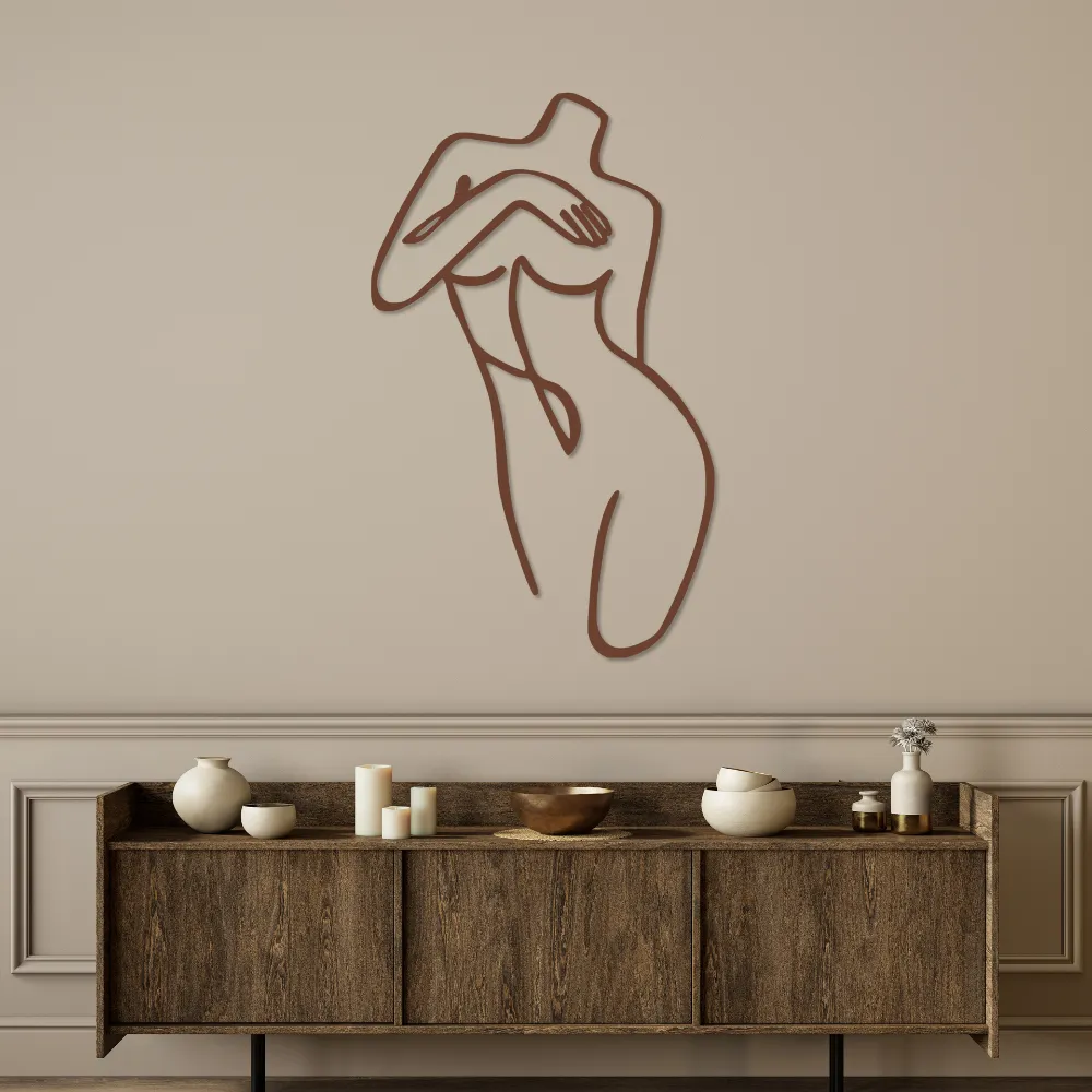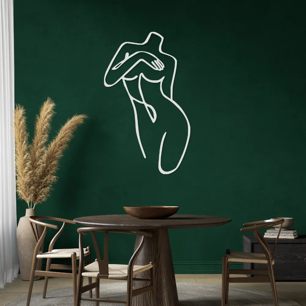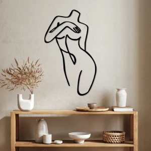 Artystyczna sylwetka kobiety, dyskretnie osłaniająca piersi, wprowadza do wnętrza atmosferę subtelnej zmysłowości i nowoczesnego minimalizmu.
