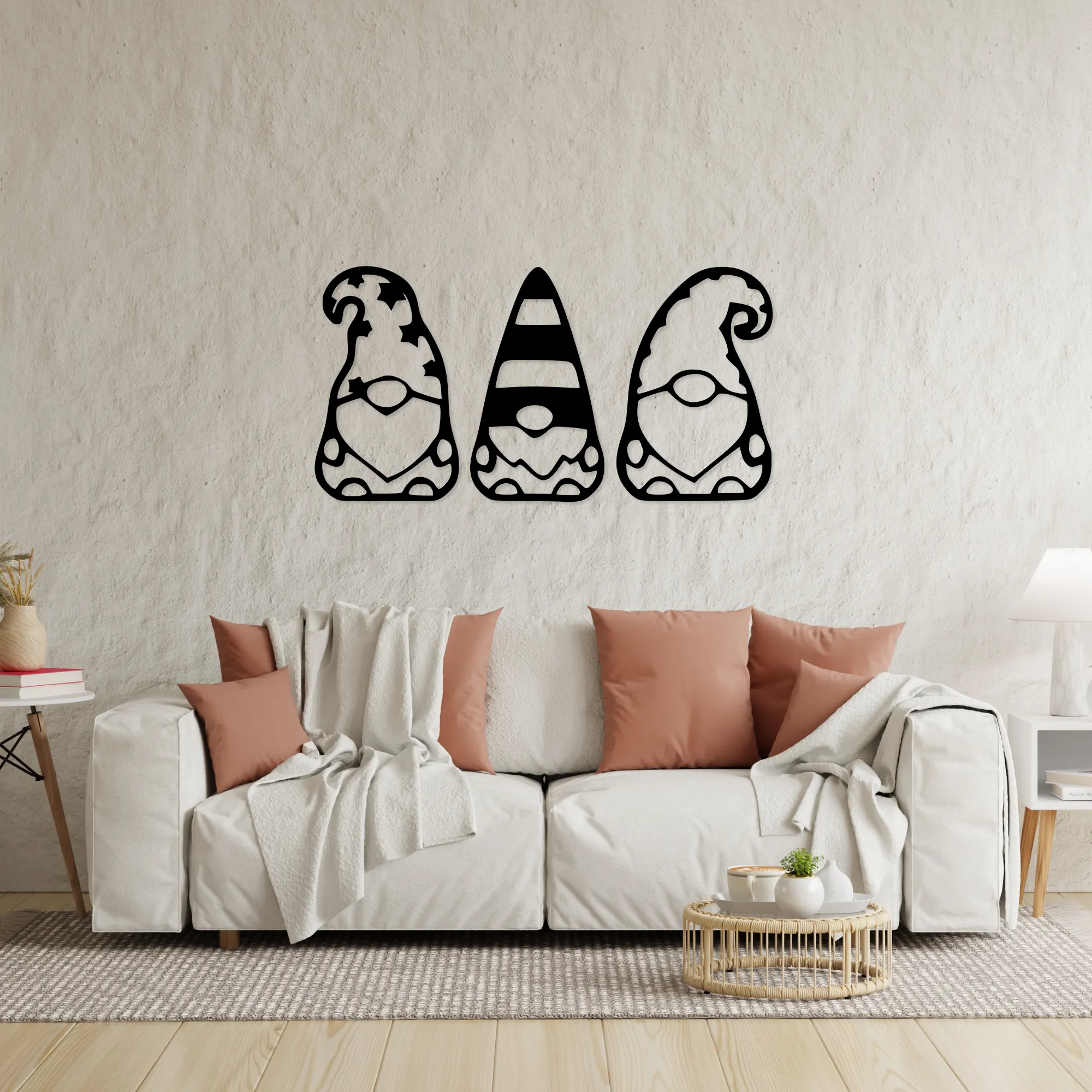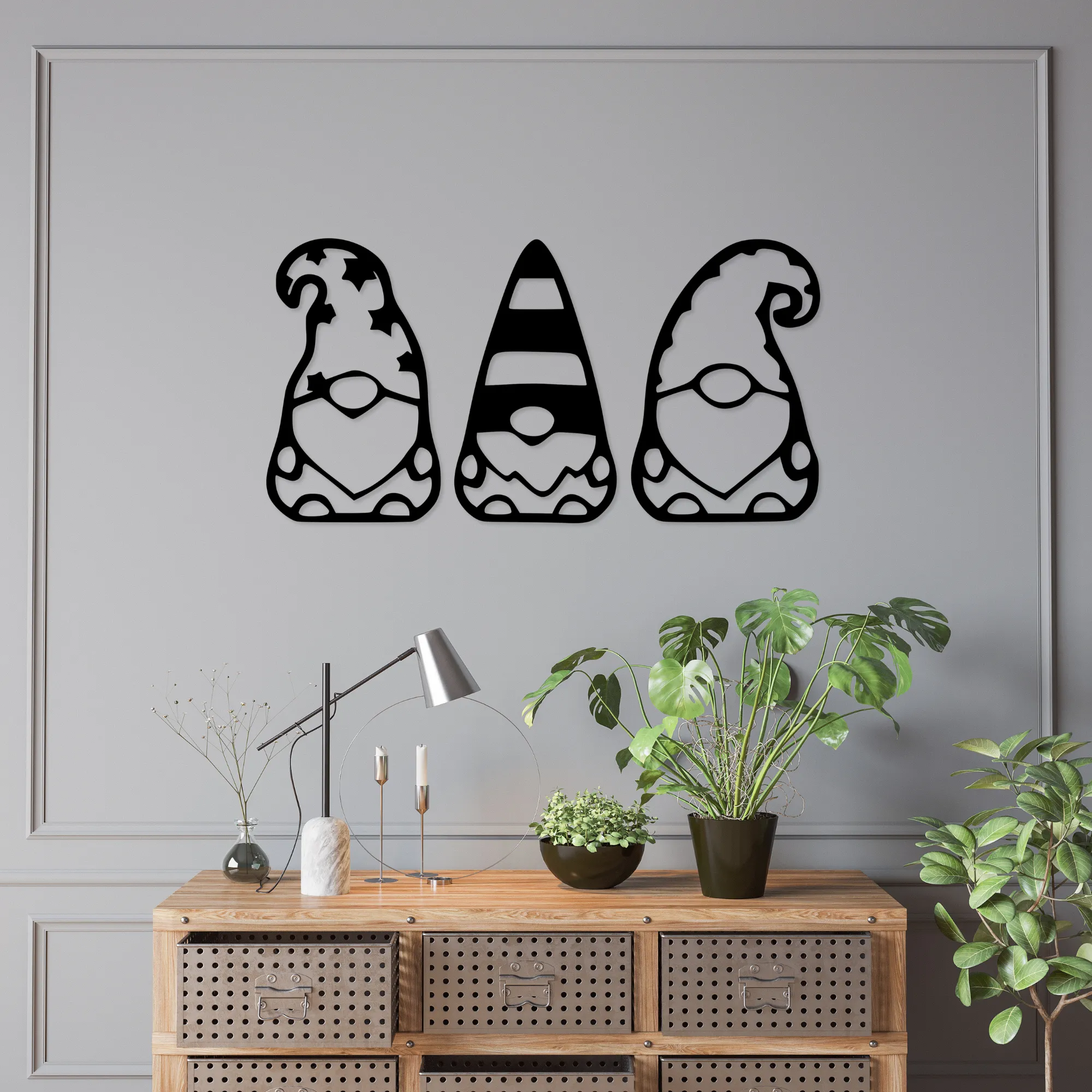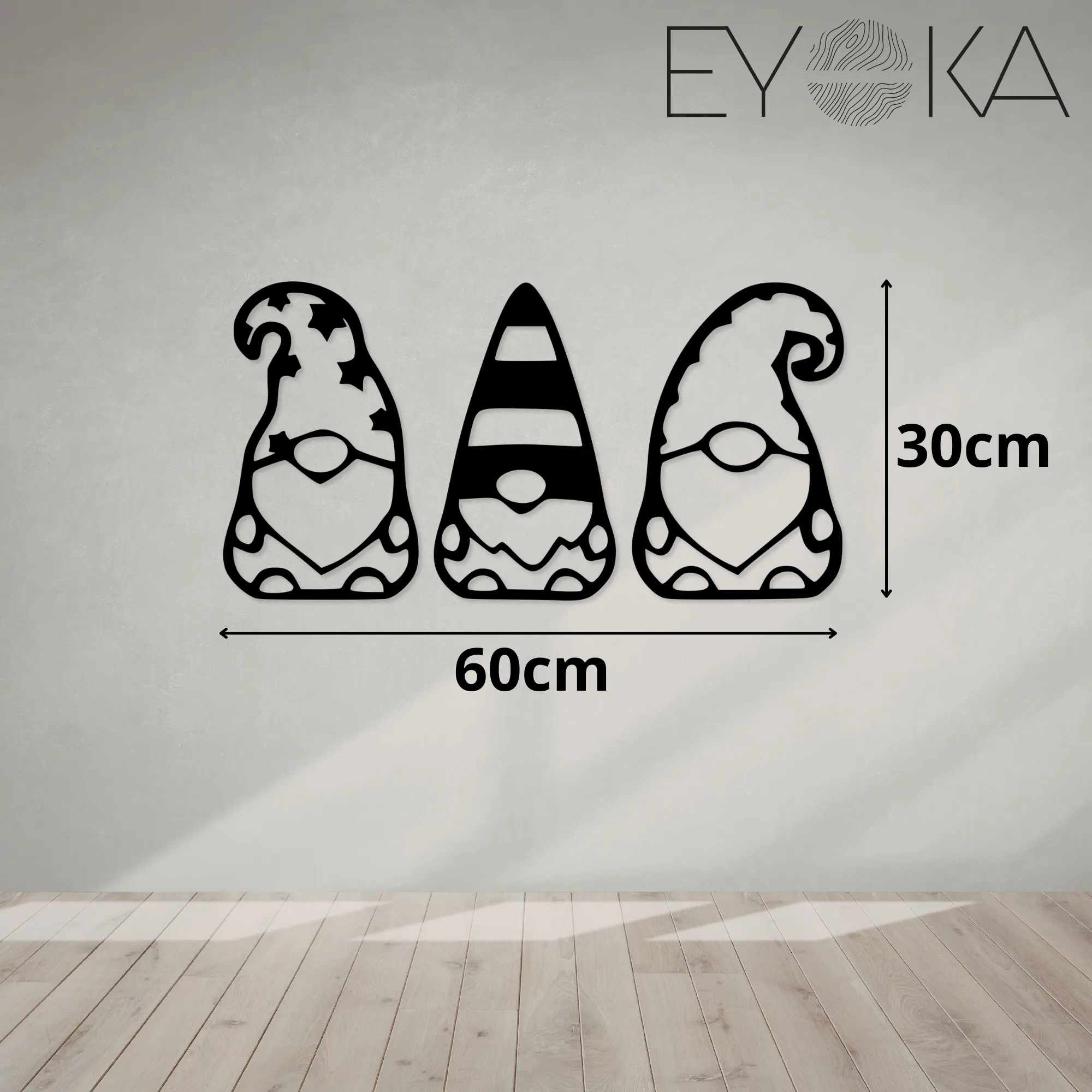 Drewniany ażurowy obraz 3D Trzy skrzaty to dekoracja, która wprowadza do wnętrza ciepło, radość i odrobinę magii. Sylwetki trzech skrzatów tworzą spójną, przyjazną kompozycję, kojarzącą się z domowym klimatem, spokojem i dziecięcą wyobraźnią.