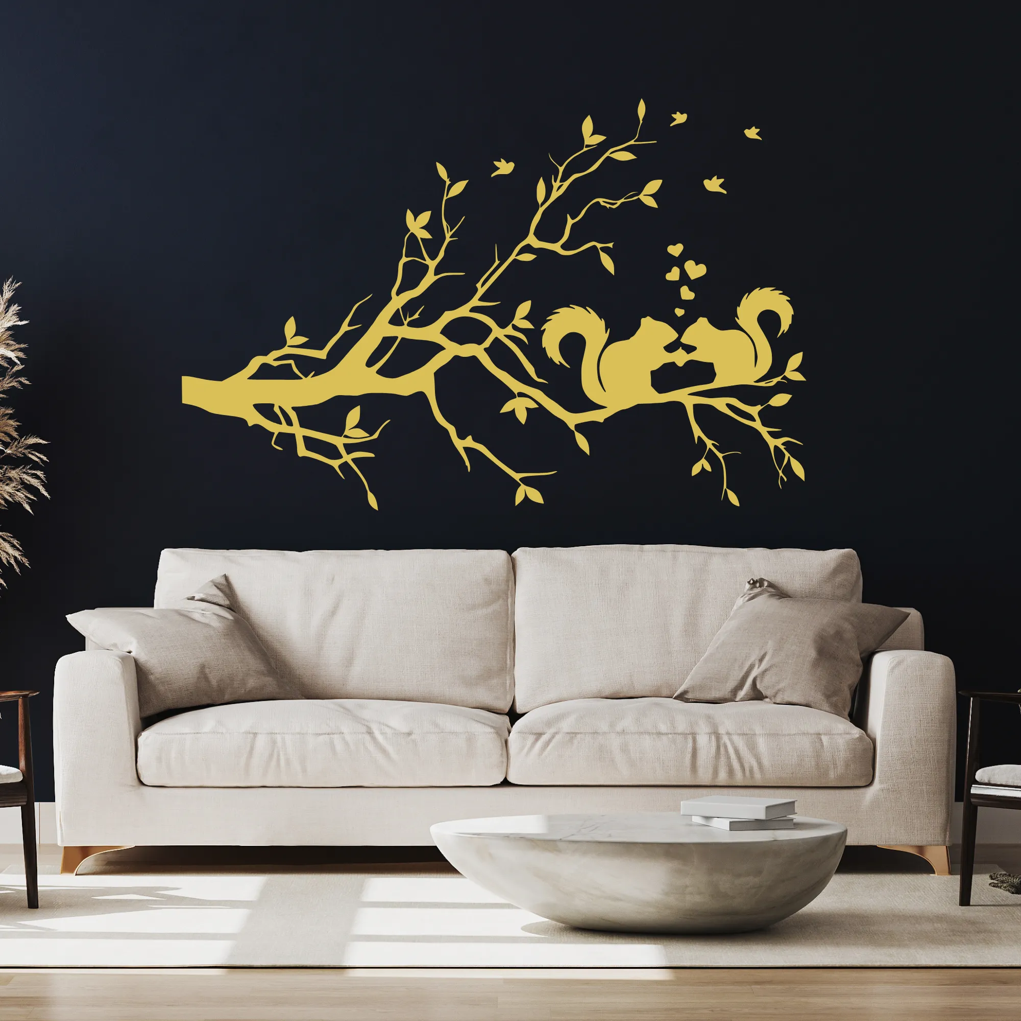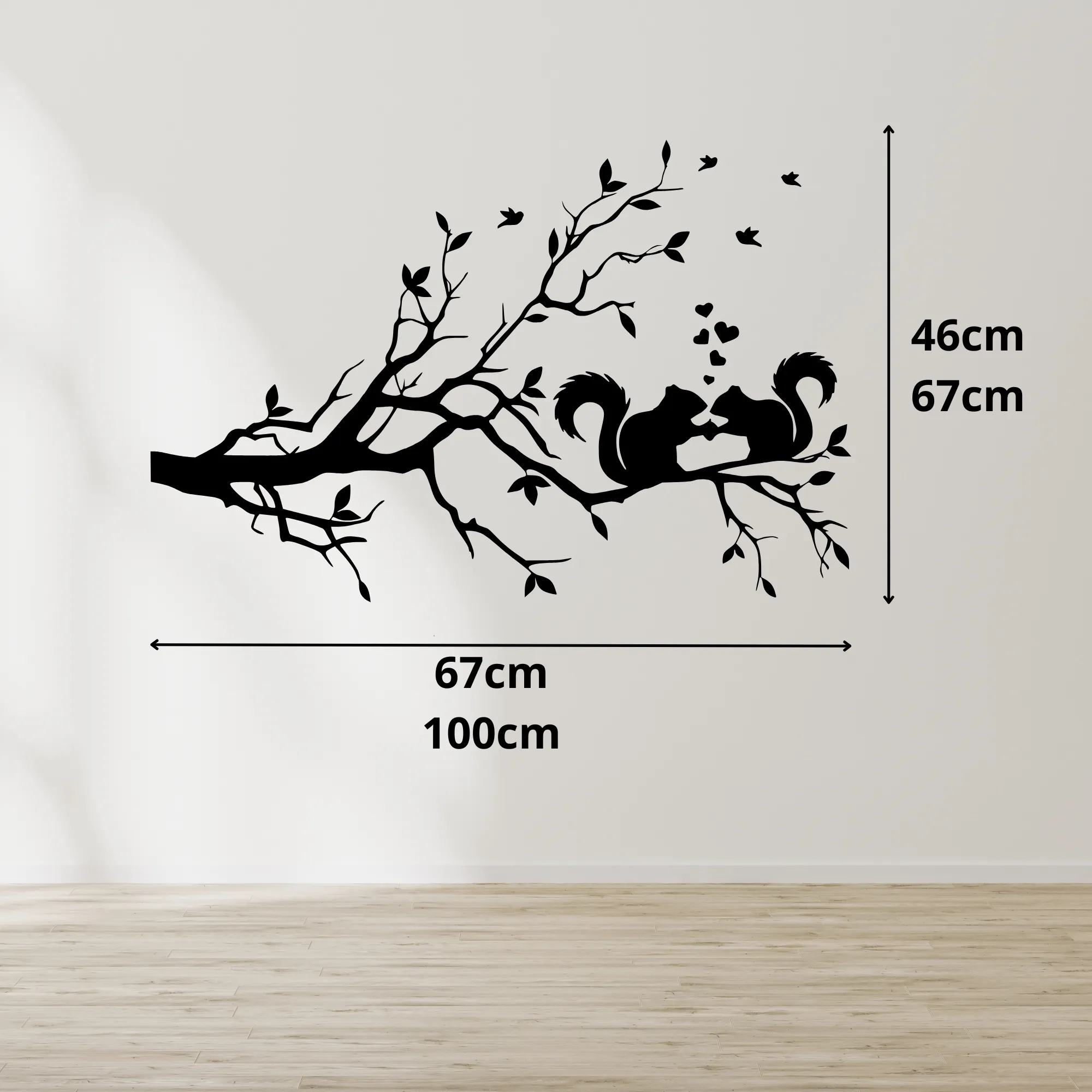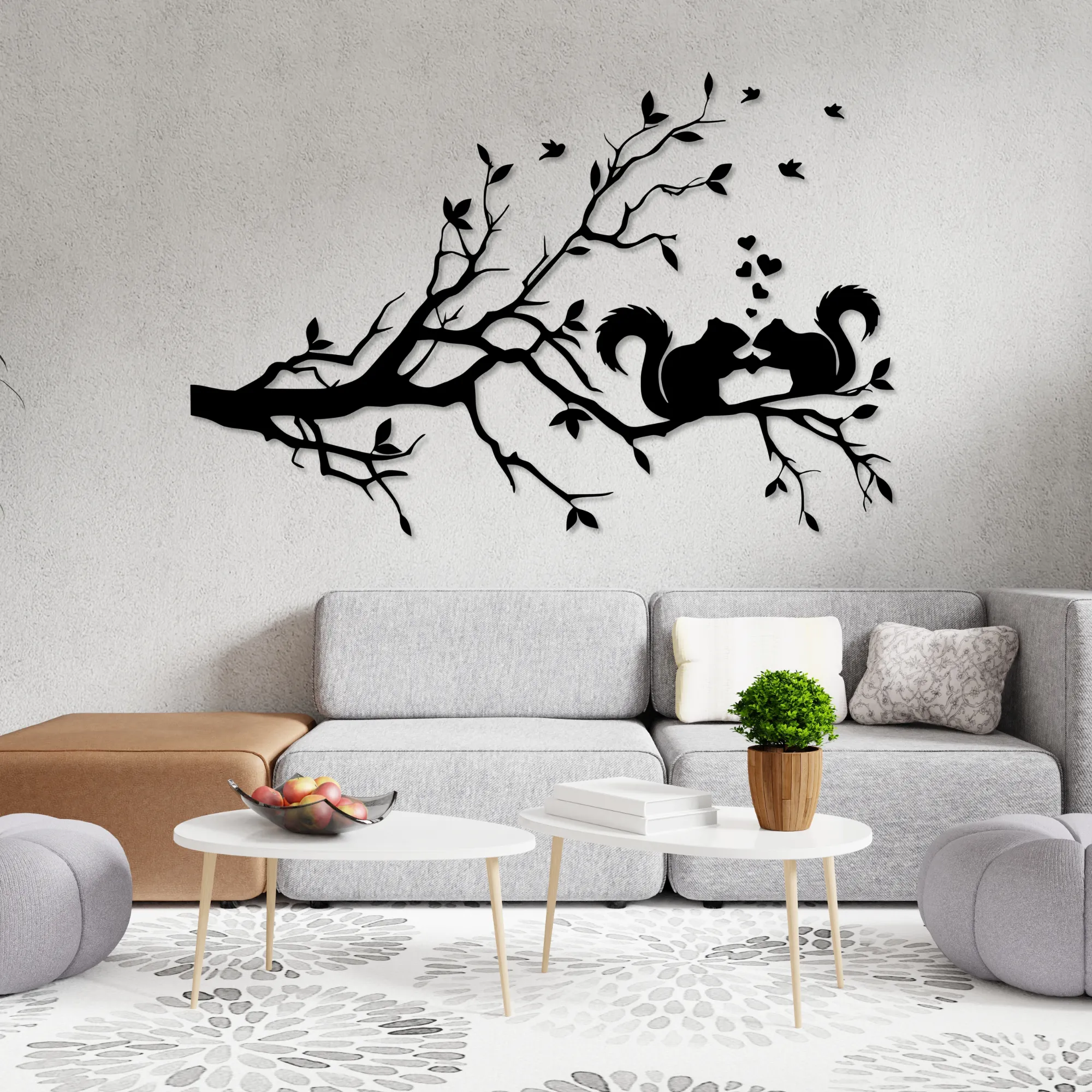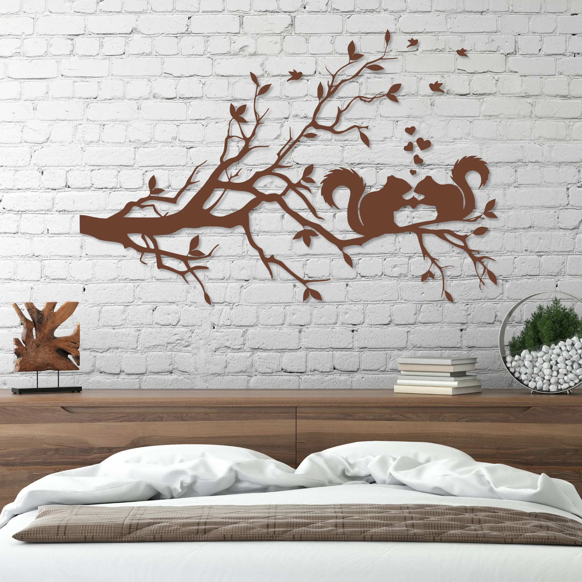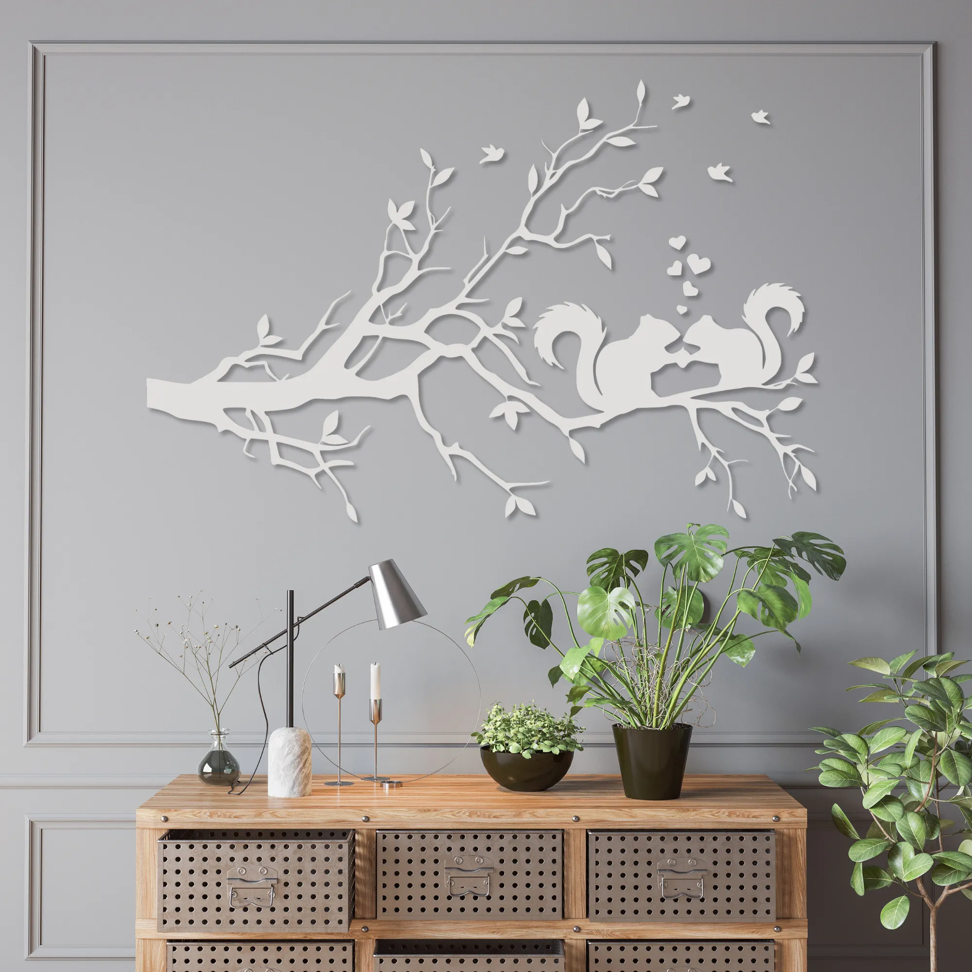 Starannie wycinane laserowo detale nadają projektowi elegancji i głębi, a motyw wiewiórek siedzących na gałęzi wprowadza do wnętrza naturalny, harmonijny nastrój.